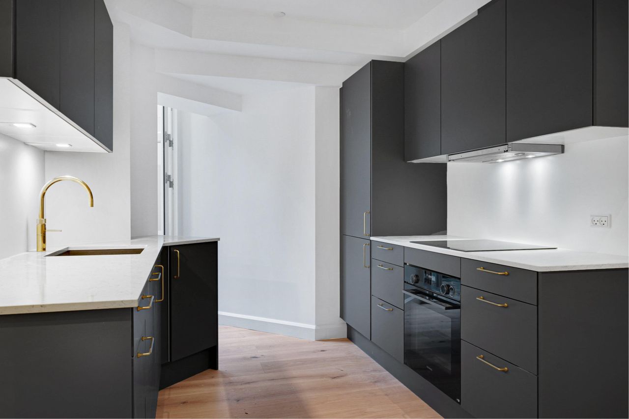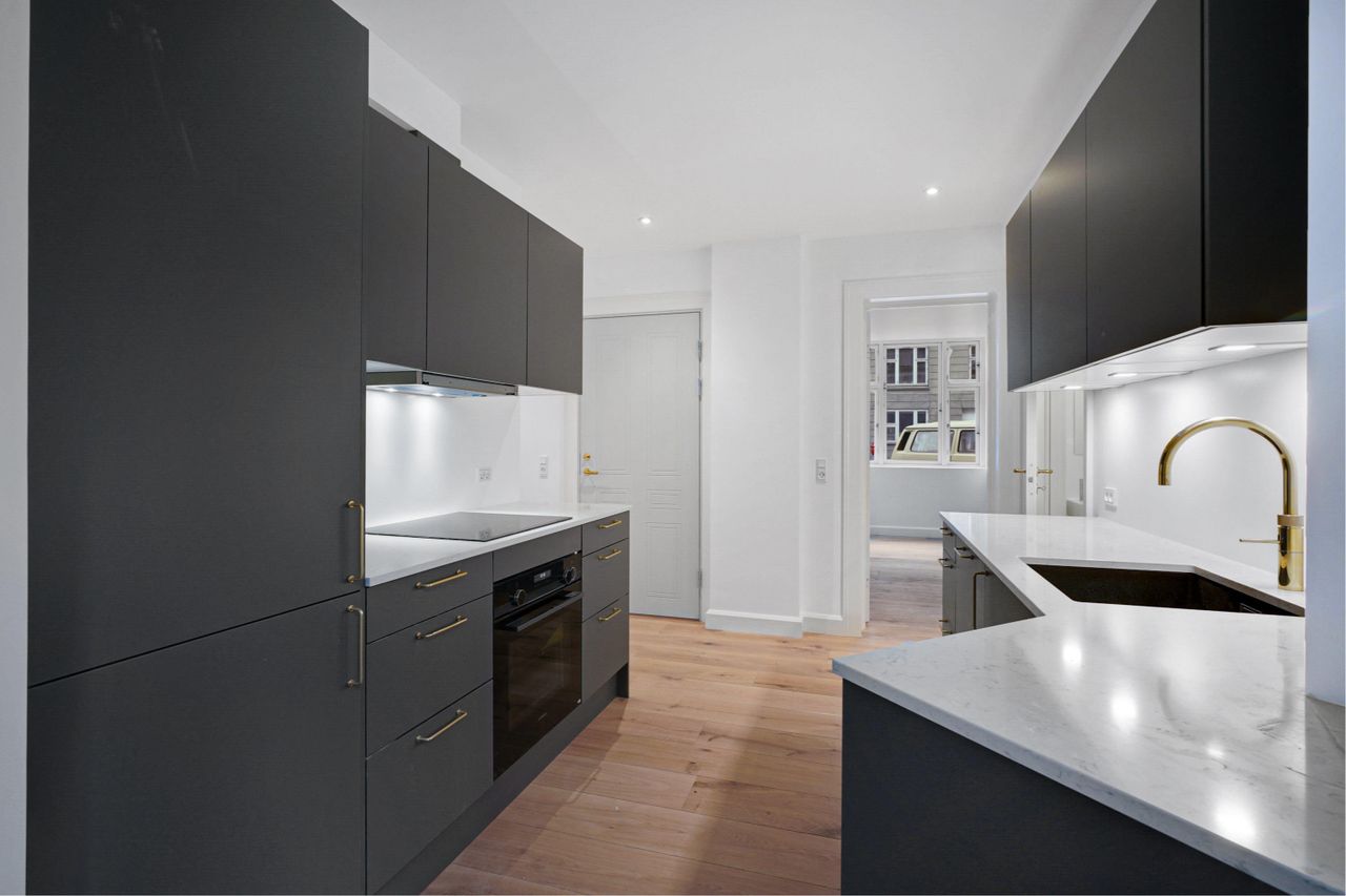 badeværelse. Køkkenet er opført i grålige elementer med messing håndtag og messing vandhane.