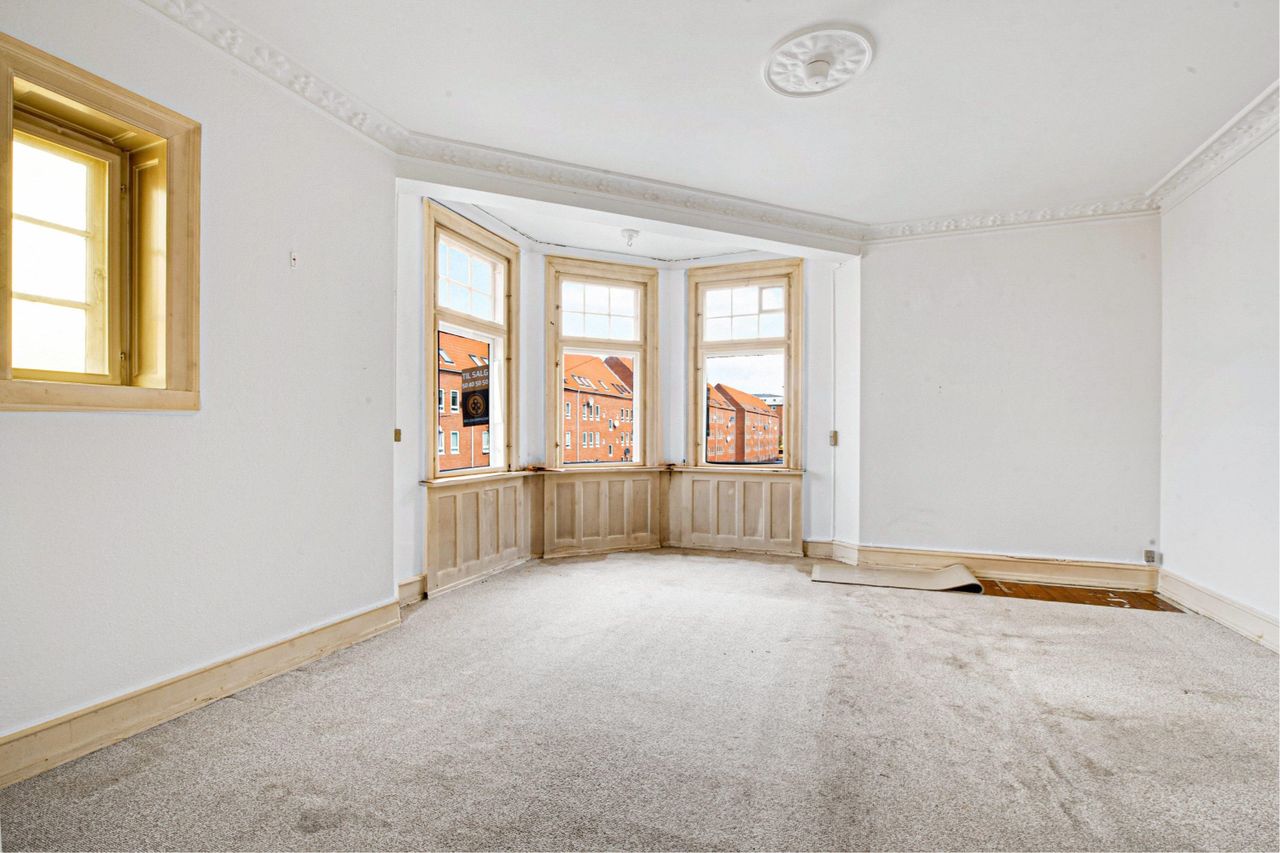 I stuerne, soveværelset og køkkenet finder I store og smukke vinduespartier, der indbydende bringer lyset ind - dette er muliggjort af lejlighedens placering på anden etage samt bygningens placering - den ligger nemlig ugeneret af andre ejendomme på trods af den centrale beliggenhed. I alle værelserne er den klassiske stil fuldendt af stuk og originale gulve. Dette er dog ikke ensbetydende med, at boligen ikke kan forbedres, for der er plads til at sætte sit eget præg på den, hvad enten man er en børnefamilie med forhåbninger om at skabe sit eget eller forældre, der søger et forældrekøb til de unge, for at de kan starte deres eget.