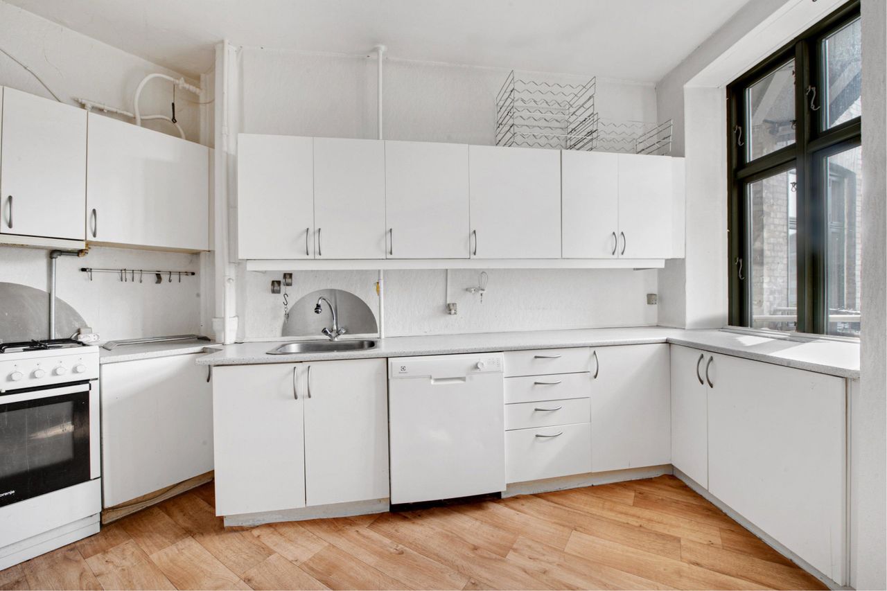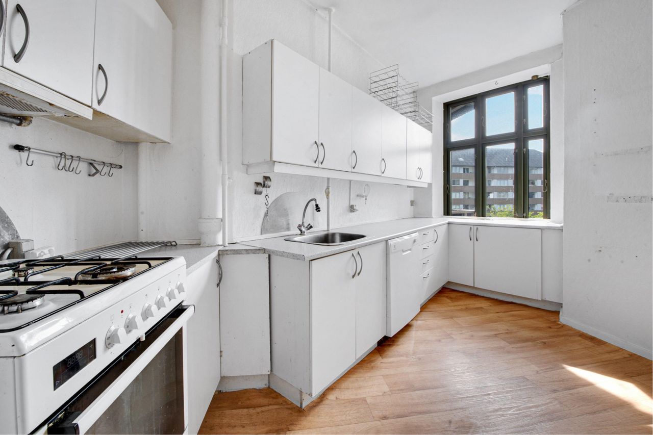 Hjemmets badeværelse er dejligt rummeligt og opfylder ikke stereotypen om københavnerbadeværelser, da der er separat brus og plads til en mulig vaskesøjle. I køkkenet fortsætter denne rummelige atmosfære, da der er god plads for familien at udfolde sig. Dette er ligeledes sagen for dem, der er interesseret i delelejligheden, hvor opbevaring og arbejdsplads ikke behøver at være et punkt, man skal gå på kompromis med. I køkkenet finder I også døren til bagtrappen, som leder ned til den hyggelige og grønne gård. Her er der plads til at nyde aftensmaden om sommeren, for børnene at lege, samt skur til cyklen - altså, alt hvad man kunne ønske sig af en hyggelig gård på Nørrebro!