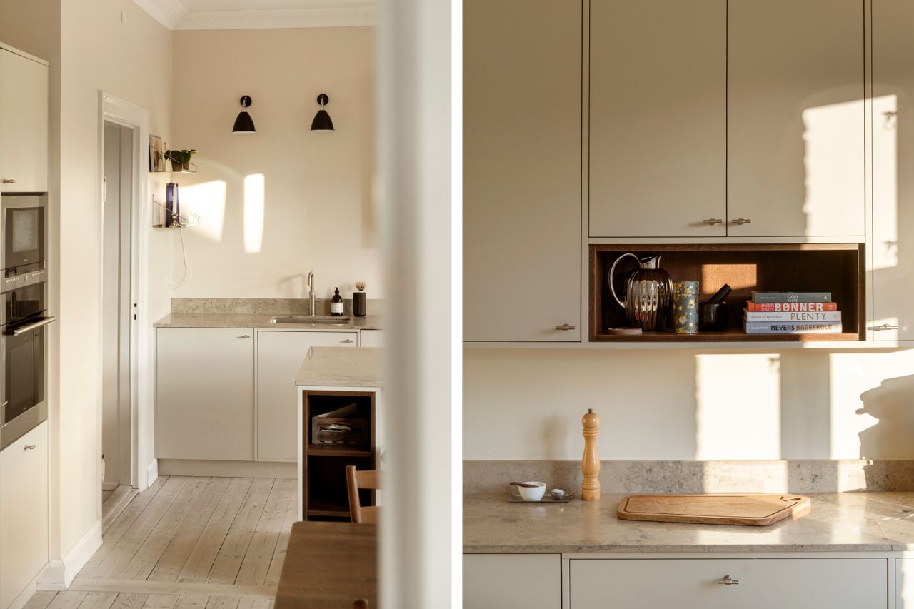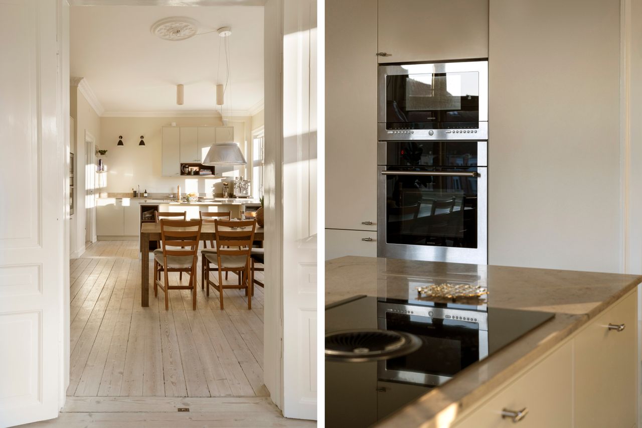 Et køkken-alrum i åben forbindelse med en elegant hjørnestue, hvor lyset får lov at danse dagen lang.