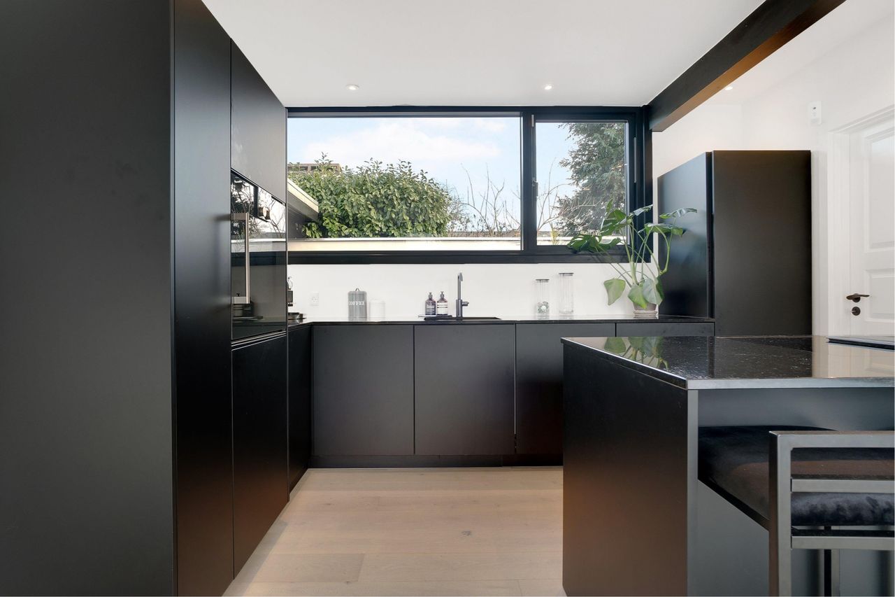 køkkenelementer, bjælker og vinduesrammer, som skaber en flot kontrast til de ellers så lyse trægulve og