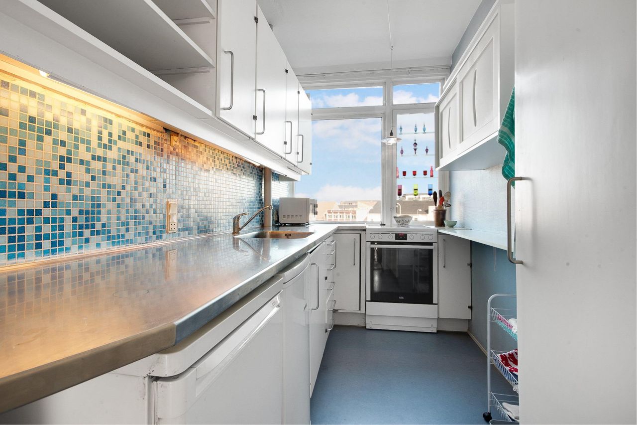 værelser, et veldisponeret køkken i blå nuancer med masser af opbevaringsplads, flisebadeværelse med