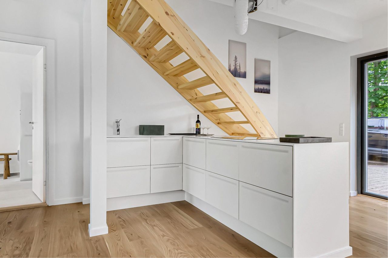 atmosfærer. Køkkenet har elegant integrerede elementer i det stilrene design med hvide fronter. Selve