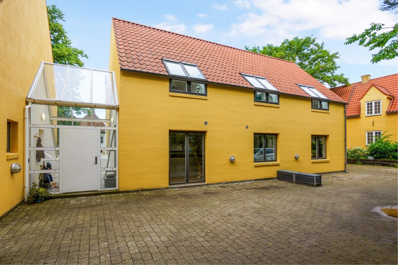 Ejendommen blev opført i 1987, og fremstår stadig meget flot og velholdt, med den fine gule facade der