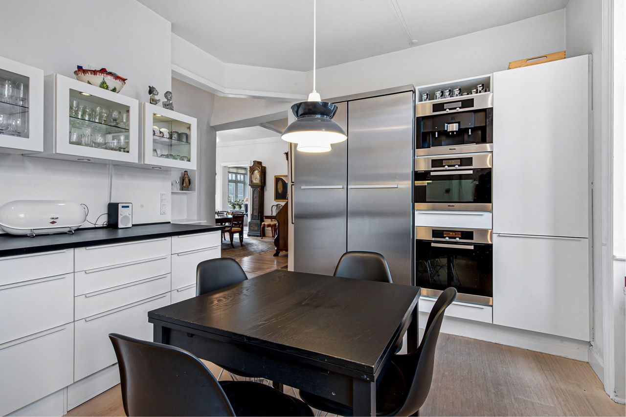 videre til hjemmets store spisekøkken. Køkkenet er fuldt udstyret med alle hårde hvidevarer og prydes af