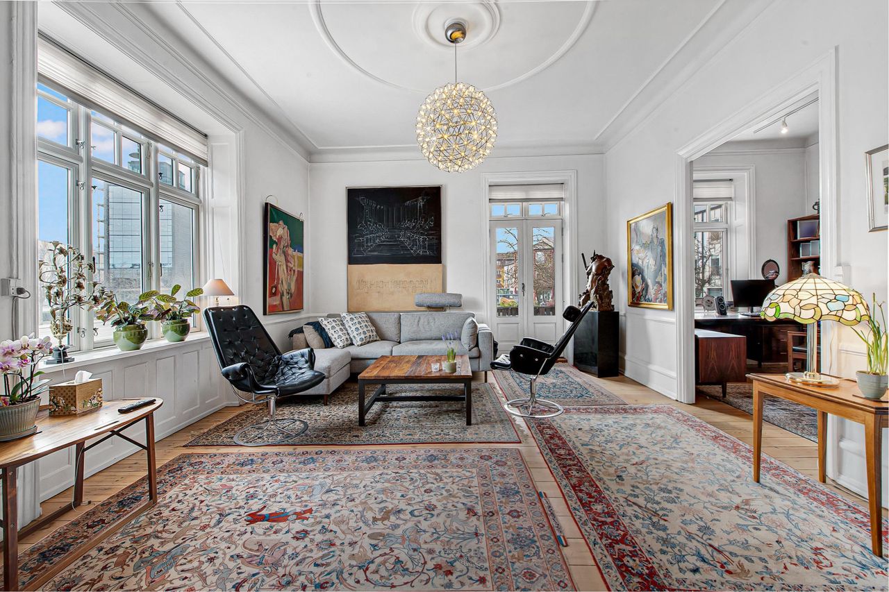 herskabelig stemning grundet de nydelige stuklofter, de brede åbninger mellem rummene og det