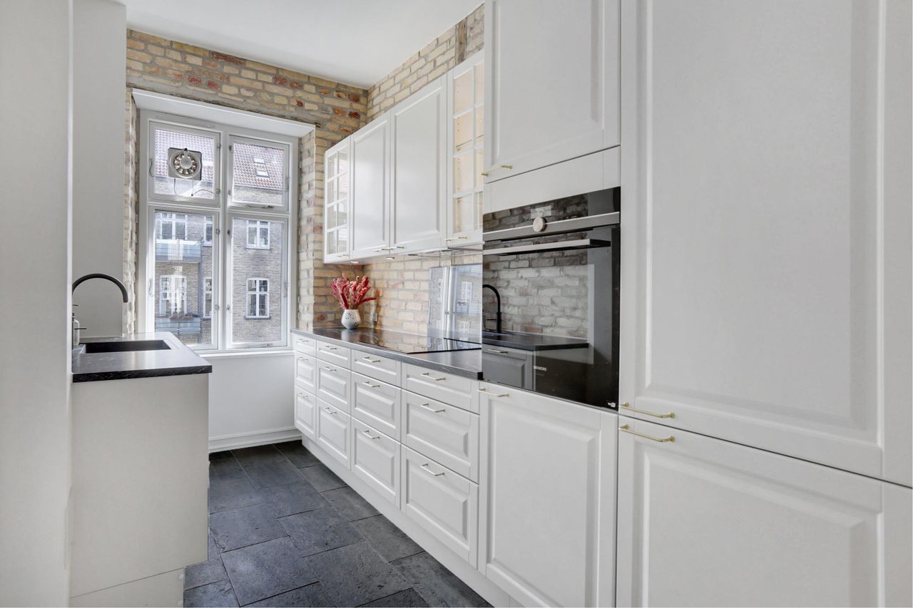 køkkenelementer. Her er naturligvis alle hårde hvidevarer, mens det store vindue bidrager med et fint kig